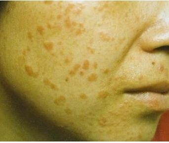 2. 皮损为帽针状至绿豆或稍大的扁平光滑丘疹,呈圆形、椭圆形或多角形,质硬,呈正常皮色或淡褐色。