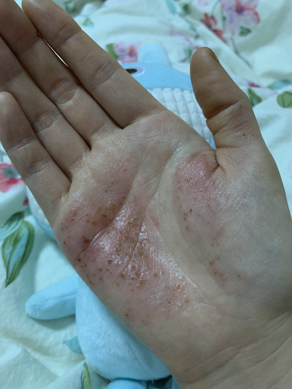 掌跖脓疱病变轻时,皮损局限于手掌足底一侧,重时可以对称于两个手掌,足弓,甚至整个手掌,足底均会受累,典型的皮损为掌心,足弓处成批出现针尖帽大小深在性水疱,伴有中度搔痒,水疱逐渐增大,中心出现小黄点,外周仍透明,黄点迅速向外扩展形成脓疱,经过5-7天,脓疱吸收、表皮增厚、脱落,其下可见红色嫩薄的表皮,以及红嫩的表皮下方有水疱、脓疱,如此反复发作,迁延不愈。病情严重时可有糜烂、渗液或皲裂、疼痛,给病人带来极大的痛苦。
