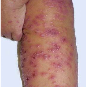 本病为自身敏感性皮炎的特殊型,在发生前患处附近有慢性细菌性感染病灶,临床以病灶周围发红、密集小水疱、水疱、脓疱、 结痂、鳞屑、红疙瘩为特征。发病前有慢性细菌感染灶,排出大量分泌物。