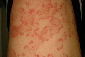 2、银屑病:银屑病,俗称牛皮癣,是一种常见的具有特征性皮损的慢性易于反复的炎症性皮肤病。初起为炎性红色丘疹,约粟粒至绿豆大小,以后逐渐扩大或融合成为棕红色斑块,边界清楚,周围有炎性红晕,基底浸润明显,表面覆盖多层干燥的灰白色或银白色鳞屑。轻轻刮除表面鳞屑,逐渐露出一层淡红色发亮的半透明薄膜,称薄膜现象。