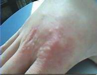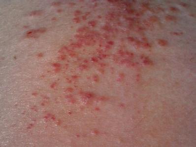 湿疹:湿疹是一种常见的表皮及真皮浅层炎症性皮肤病。在临床上有多种表现,在病程发展中红点、红斑、丘疹、水疱、脓疱、糜烂、结痂等各型皮疹症状可循序出现。湿疹症状出现初期,皮肤浸润增厚,逐步变成暗红色及色素沉着;湿疹持久不愈时,皮损纹变粗大,表现干燥而易发生皲裂,常见于手足、胸部、小腿、肘窝等处。