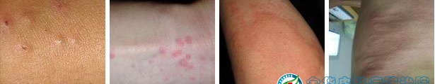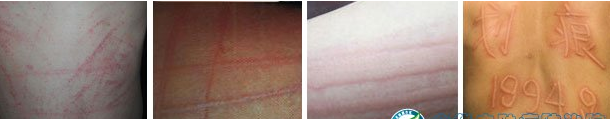 4、人工(划痕性)荨麻疹:又叫皮肤化痕症,多见于过敏体质人群,皮肤经划后可出现条条红斑,其边缘伴有红晕,并有瘙痒症状。